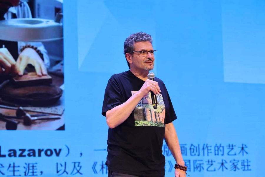 值得一提的是,结合“国际艺术家驻留计划”,欧洲现代木口木刻版画界代表人物彼得·拉沙洛夫亲临现场,观看了展览并进行采风创作,后续他将创作作品加入到展览中。